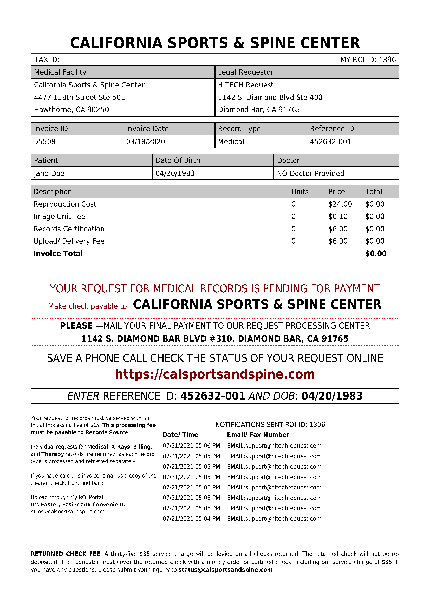 Final Production Check Must be payable to the "CALIFORNIA SPORTS & SPINE CENTER"